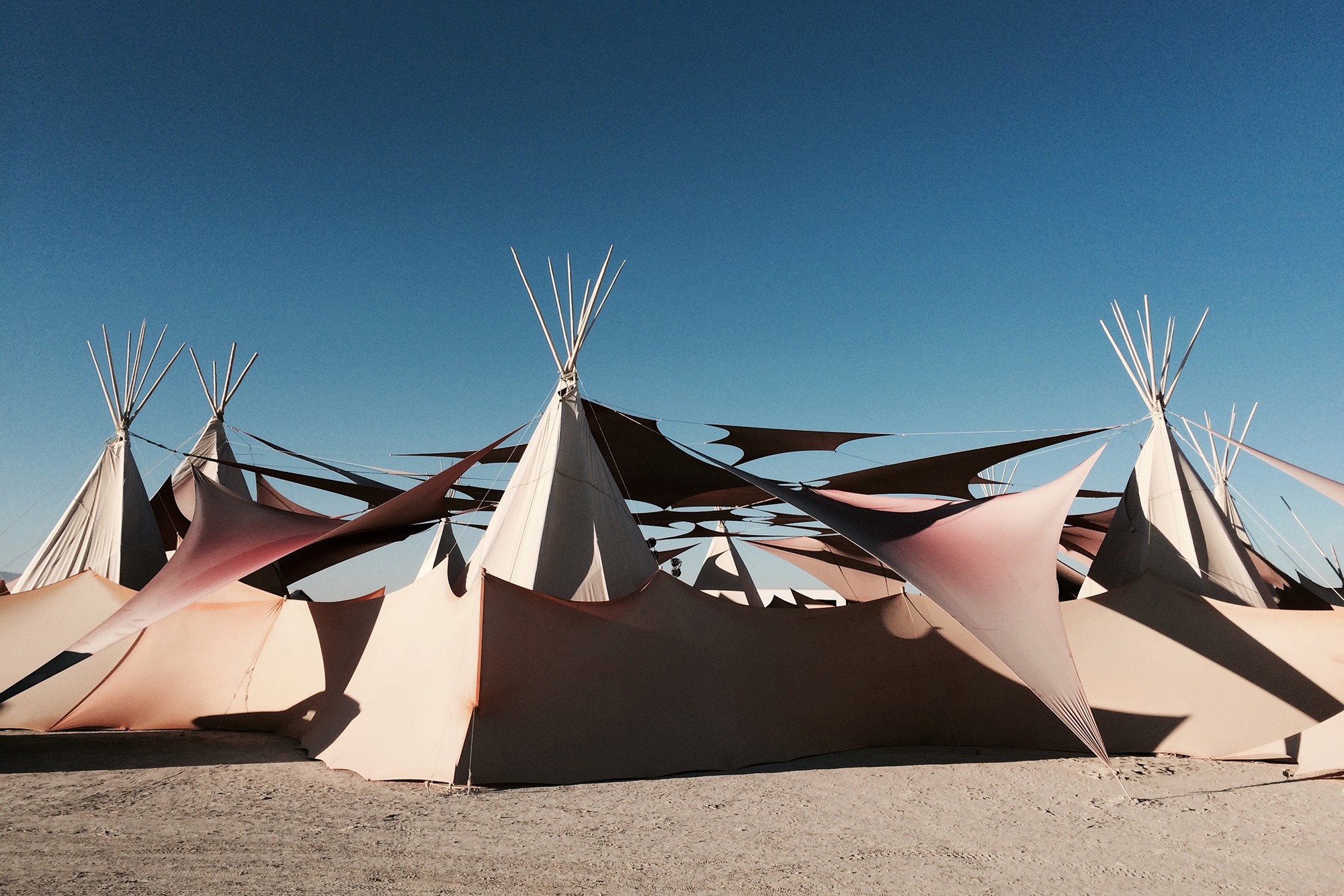 How to design for local conditions: This camp structure is built for providing maximum protection from the sun, whilst leaving enough space for the wind to pass through. In addition, it creates a beautiful play of light and shadow.